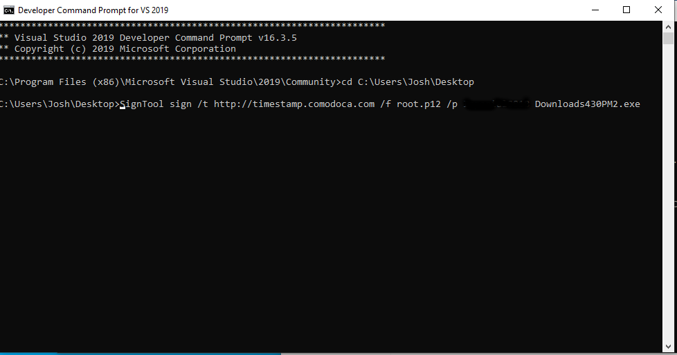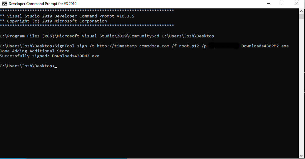 SignTool sign /t http://timestamp.comodoca.com /f codesigning.p12 /p <Password> file.exe