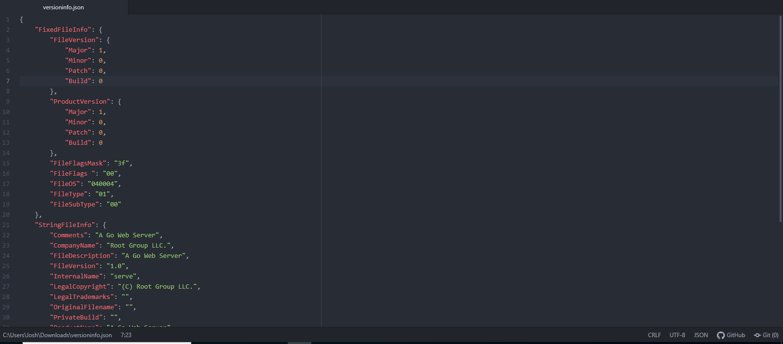 This will create a configuration file named versioninfo.json in the current directory. There are three things you will want to edit: 1. The version of the application, 2. The "publisher" or company name and 3. The product name.